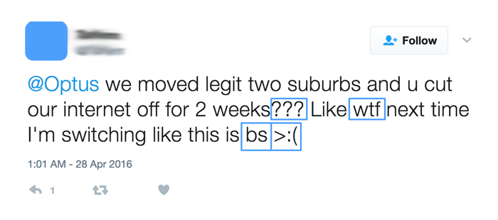 Como hemos comentado, el trabajo para generar los léxicos es bastante costoso y requieren mucho tiempo de producción, por lo tanto, la frecuencia de actualización no es muy elevada. Esto significa que los léxicos carecen de la última jerga actualizada y esto puede suponer un problema. En la figura 1 se puede ver un ejemplo de esta situación, ya que el usuario muestra su opinión de descontento a través de una jerga muy actual (cuadros azules) utilizando signos de puntuación múltiples, acrónimos y un emoticono. Si el análisis no tiene en cuenta estas expresiones, este tweet negativo se clasificaría como neutral por el resto del contenido.