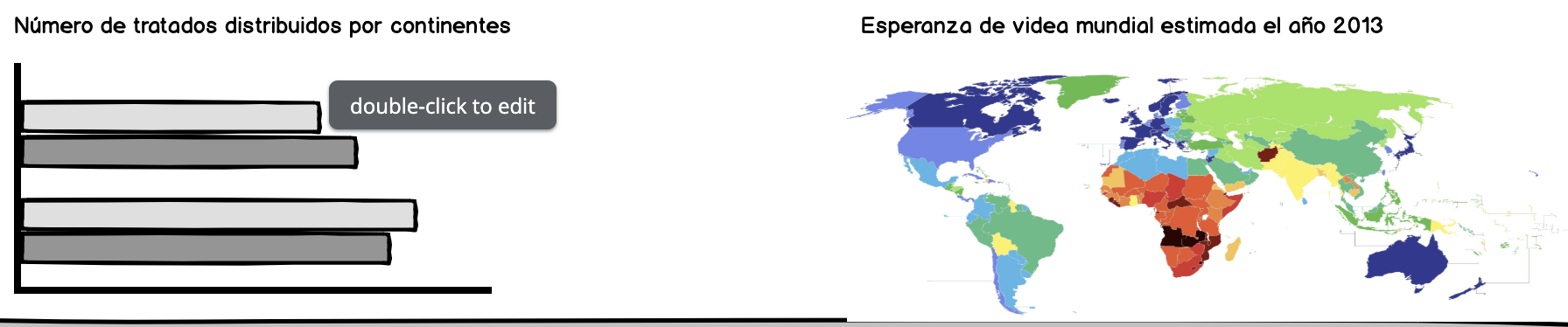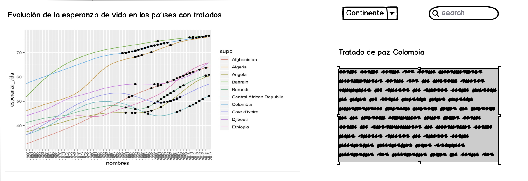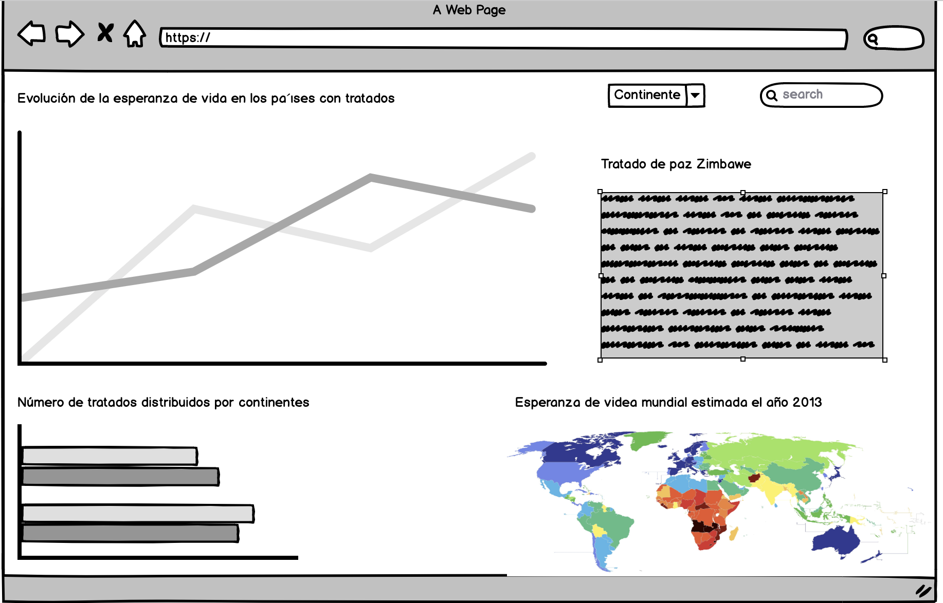 En este bloque se analizará el diseño de la visualización a través de un Mockup. La herramienta escogida para llevar a cabo esta tarea ha sido Balsamiq [11] , una herramienta que permite diseñar de forma rápida y sencilla maquetas de interfaz para webs y aplicaciones móviles. Mediante esta aplicación el diseñador puede organizar widgets preconstruidos utilizando un editor WYSIWYG de arrastrar y soltar. La aplicación se ofrece en una versión de escritorio, así como en un complemento para Google Drive, Confluence y JIRA.La elección de la herramienta viene escogida por el formato de la visualización. El tipo de dato mostrado y su volumen exige que sea una representación digital. La representación web permite al usuario escoger que parte de los datos desea visualizar y, por lo tanto, permite interpretar correctamente la información.El resultado obtenido de este proceso ha sido la siguiente figura: 1 Mockup visualizaciónEn ella se puede comprobar como la visualización se divide en dos bloques. Como ya hemos comentado, en el primer bloque nos encontraremos las gráficas lineales que representarán la esperanza de vida de los países con tratados de paz alcanzados.