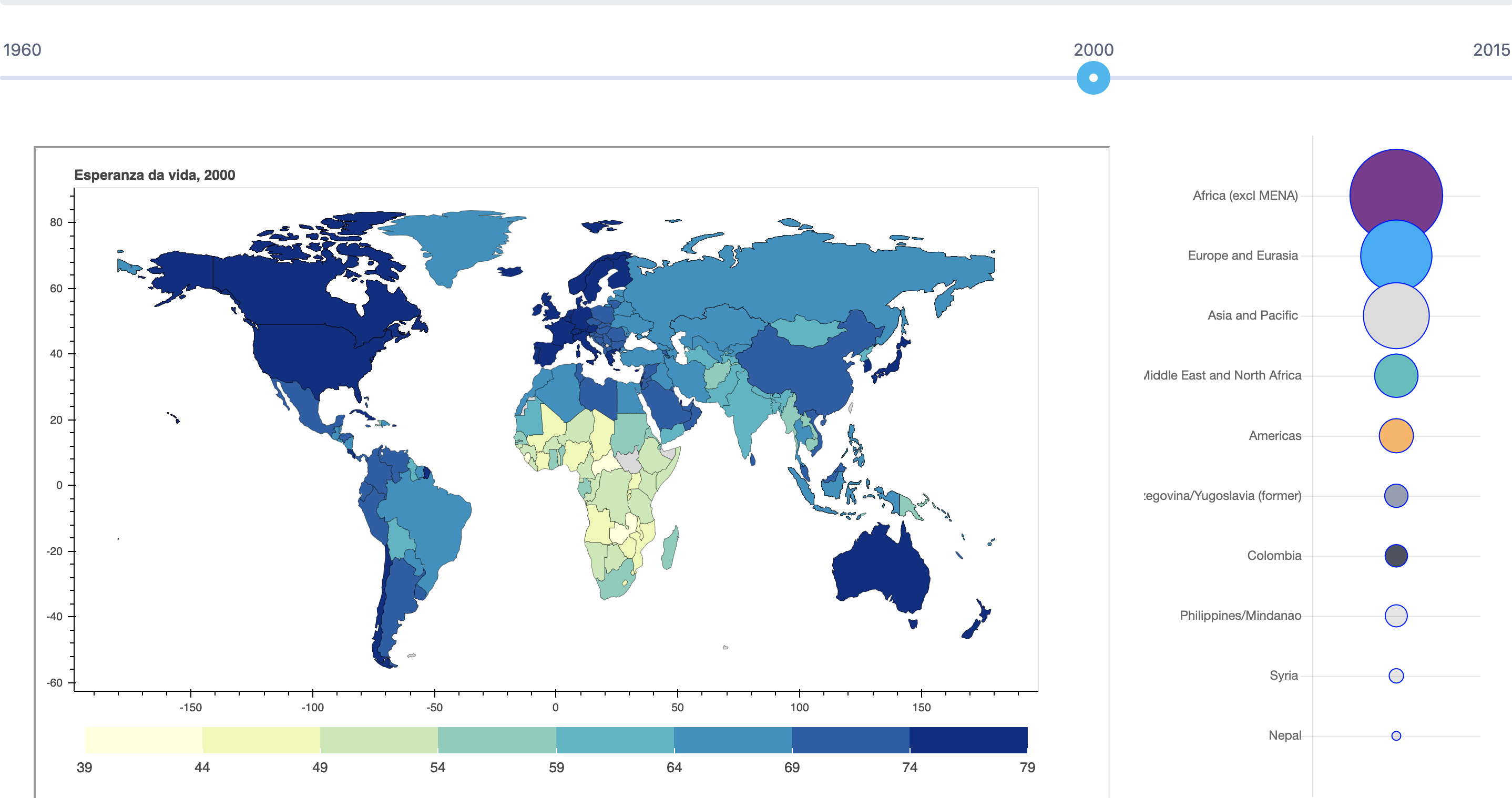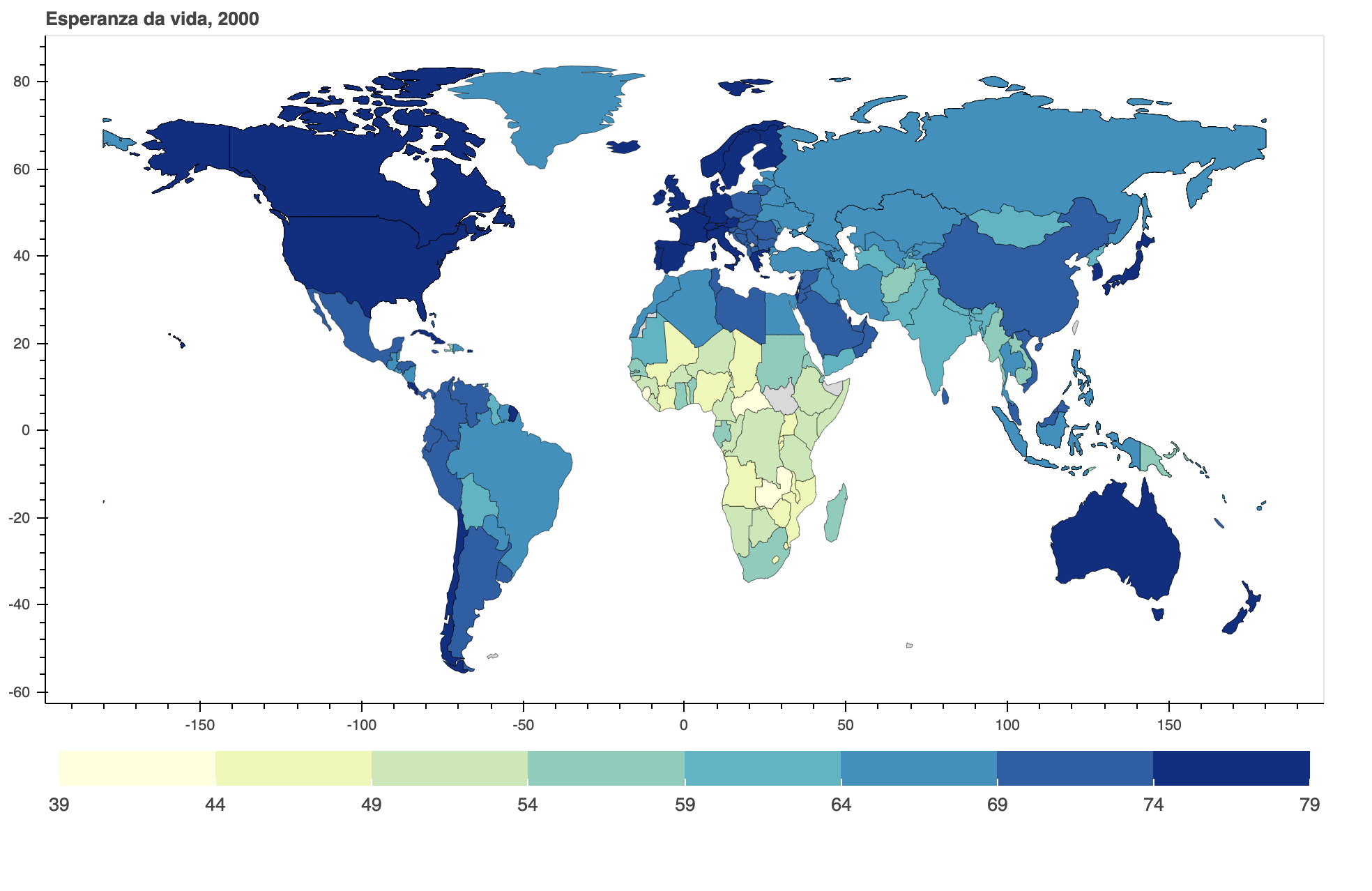 El objetivo de esta subsección es representar la esperanza de vida en el mundo, donde se puede comprobar que, los países con menos o ningún tratado tienen una esperanza de vida más larga que los que no. Para ello se deberá utilizar un mapa de calor sobre el mundo donde las tonalidades más cercanas al azul tienen una esperanza de vida más alta que las tonalidades más cercanas al blanco. Con este propósito se ha implementado en Python el código compartido en el enlace https://github.com/al118345/Georeferencia_EsperanzadeVida_Python/blob/master/Main.py. En él se puede comprobar como a través de un mapa vectorial del planeta obtenido de la web [Natural Earth] [3] se puede conseguir un mapa de calor de los datos descargados de la fuente [Esperanza de vida al nacer, total (años)] [8] . La elección de este sistema no ha sido una cuestión de azar, sino a través de un proceso de estudio y consulta de la documentación existente se ha llegado a la conclusión de que Python es la mejor herramienta para la visualización de Mapas georreferenciados [9] . Además, aparte del mapa de calor, la visualización permite recorrer al usuario el planeta e ir seleccionando la información que desea conocer. Es decir, al hacer click en un país se muestra su esperanza de vida de sus ciudadanos. Un detalle importante es que el resultado de la ejecución de este programa será mostrado en la visualización principal a través de una iframe, de esta forma podremos vincular la sección [2.3] con la sección [2.2] sin problemas. El resultado de la visualización es el siguiente: 4 Visualización Mundo