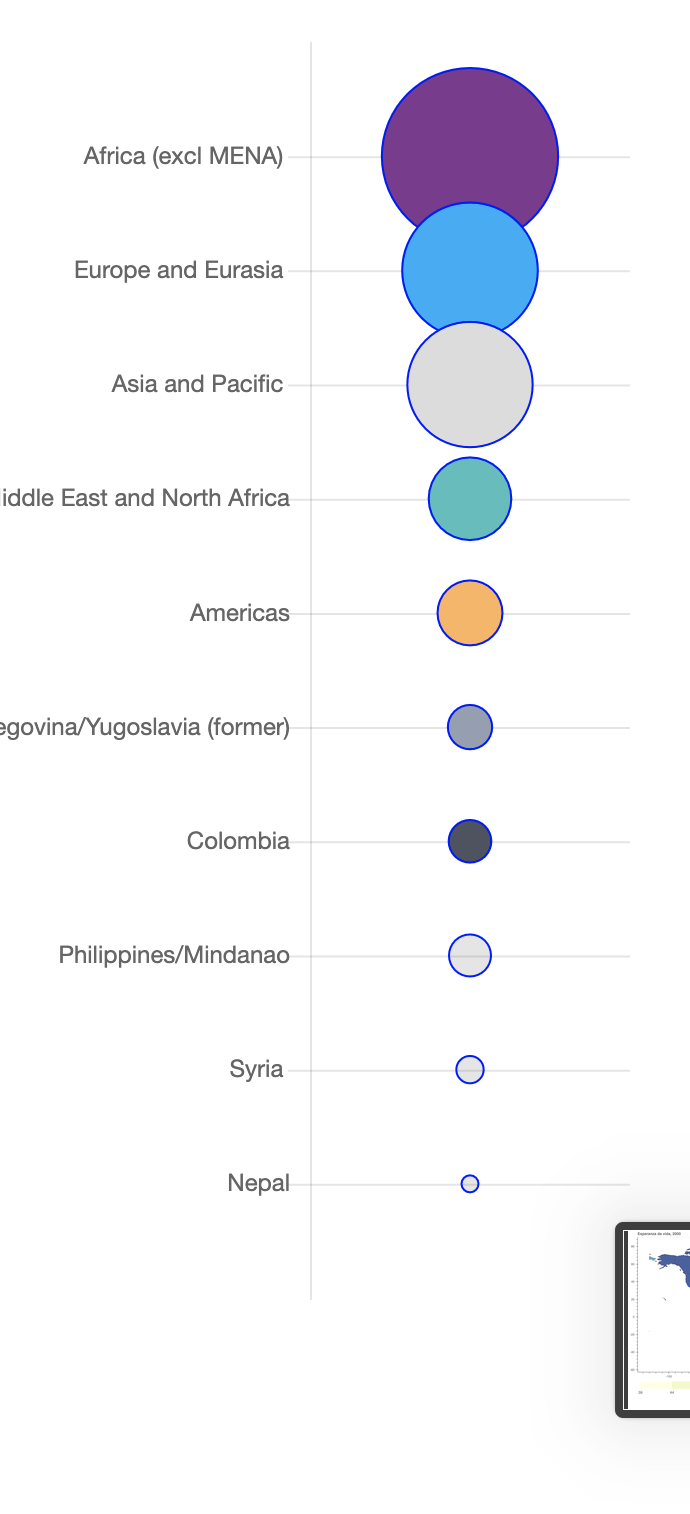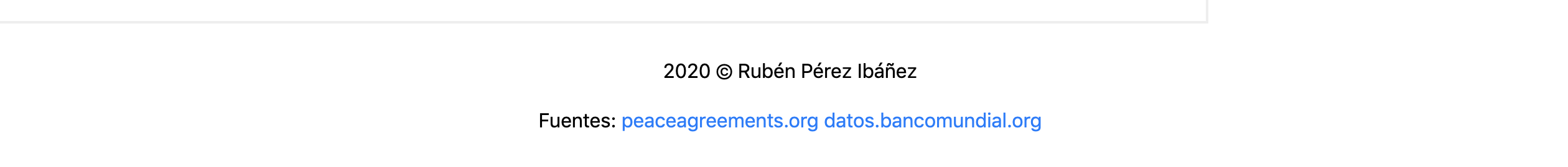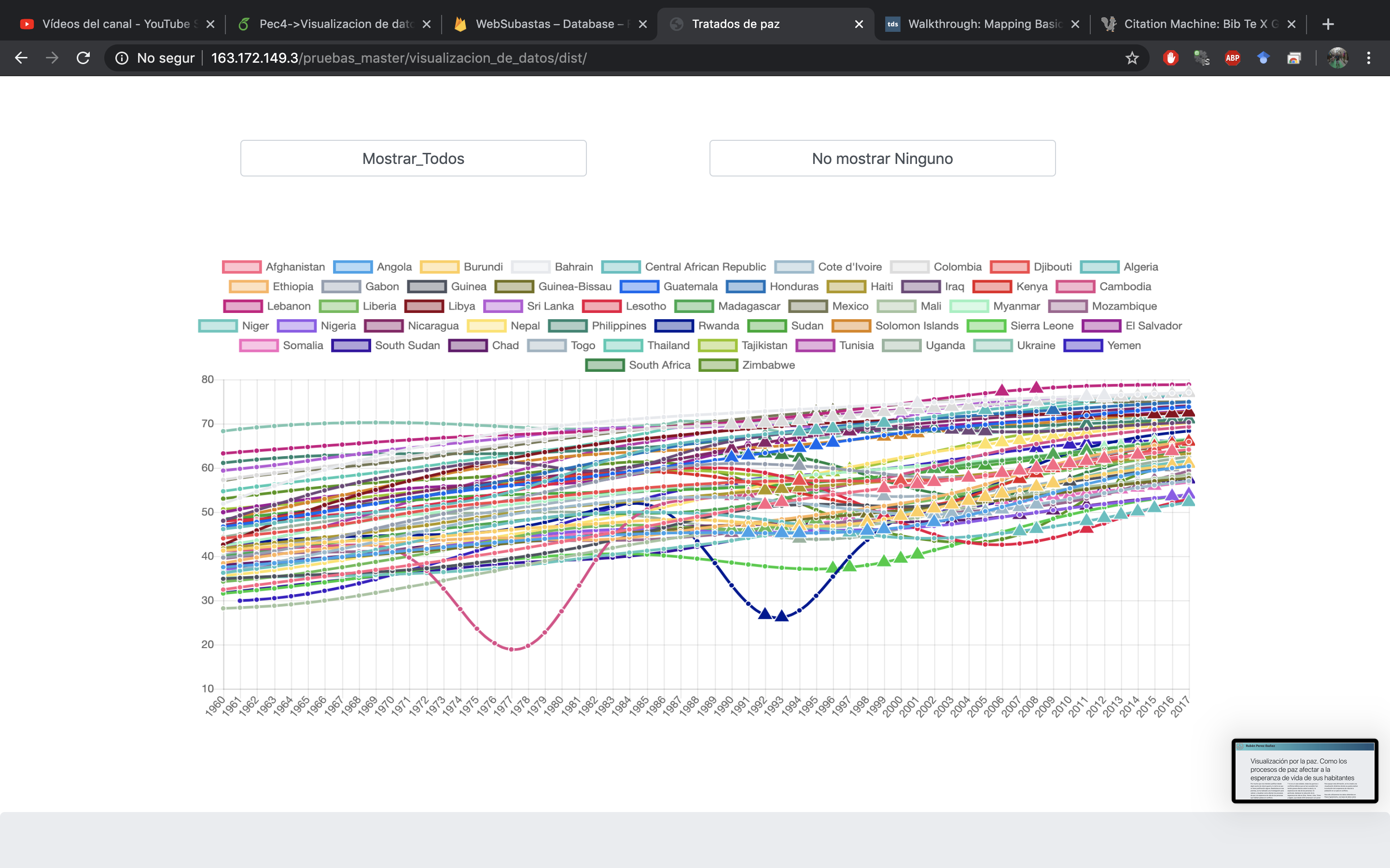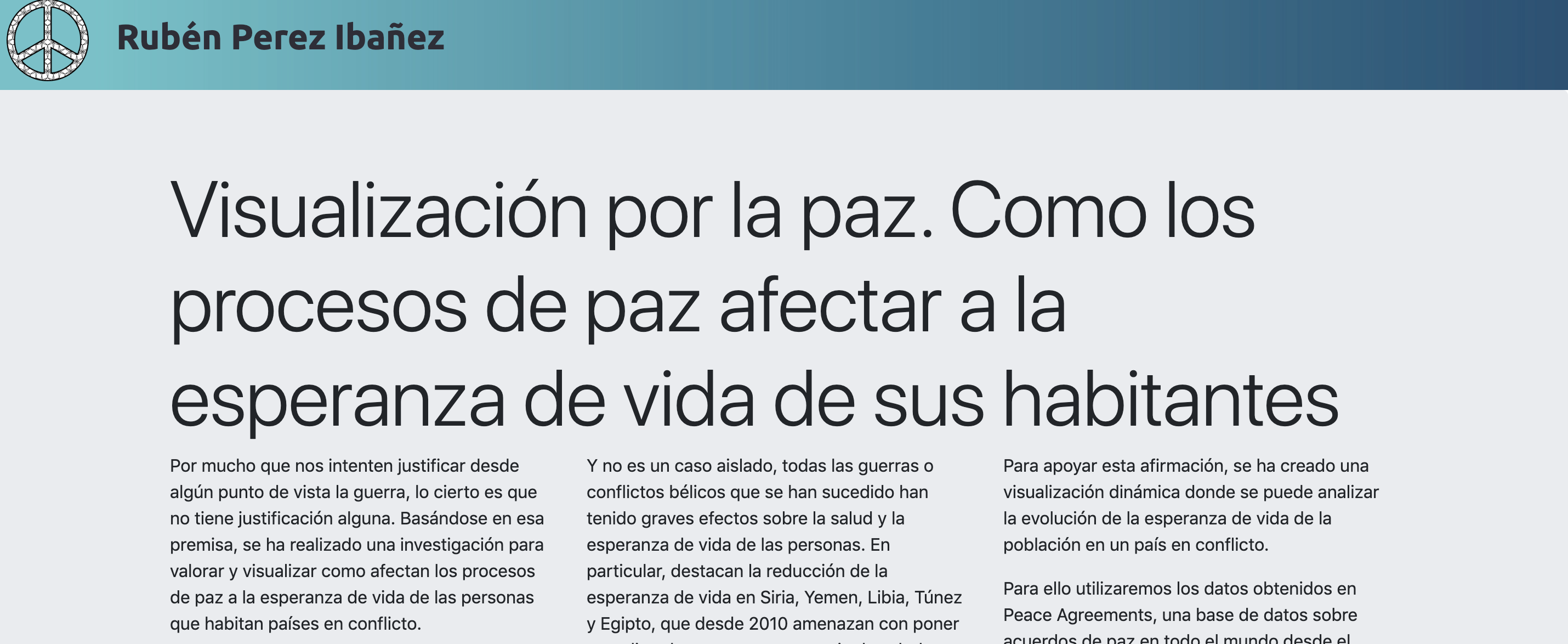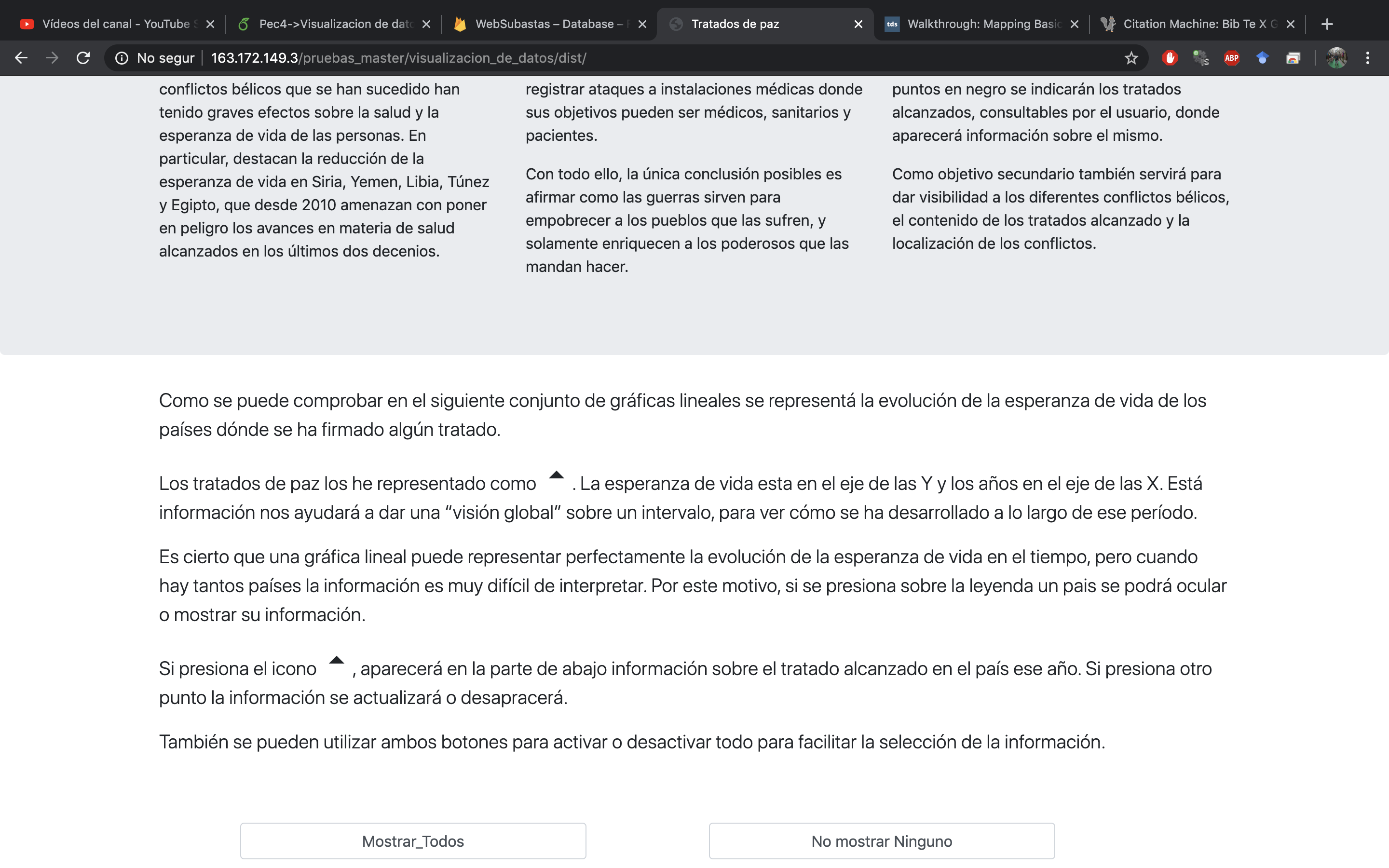 Para la maquetación y distribución de la información utilizaremos Bootstrap [15] , es una biblioteca multiplataforma o conjunto de herramientas de código abierto para diseño de sitios y aplicaciones web. Contiene plantillas de diseño con tipografía, formularios, botones, cuadros, menús de navegación y otros elementos de diseño basado en HTML y CSS, así como extensiones de JavaScript adicionales. En una primera sección, se realizará una explicación sobre el objetivo y la finalidad de la visualización. De esta forma se contextualizará la web y se expondrá su finalidad al usuario. 5 Explicación sobre el objetivo y la finalidad de la visualizaciónPosteriormente, y con una tonalidad de fondo diferenciado, se mostrará una pequeña explicación sobre el gráfico generado en esta primera sección. 6 Explicación sobre el objetivo y la finalidad de la visualizaciónComo podemos observar en la gráfica, los tratados de paz los he representado como triángulos (más expresivo que los puntos negros diseñados previamente). La esperanza de vida esta en el eje de las Y y los años en el eje de las X. Los gráficos de líneas se utilizan para mostrar valores cuantitativos en un lapso de tiempo o intervalo continuo. Los gráficos de línea también ayudan a dar una “visión global” sobre un intervalo, para ver cómo se ha desarrollado a lo largo de ese período. 7 Gráfico lineal sobre la evolución de la esperanza de vida en los países con tratados de paz alcanzado. Como se ha comentado, el problema es la cantidad de datos que vamos a gestionar. Por ese motivo presionando sobre la leyenda se podrá seleccionar los países a mostrar o ocultar. Toda esta sección se ha utilizado ng2-charts, una libreria de Javascript para la generación de gráficas. Otra mejora introducida son los dos botones superiores, que permiten seleccionar o ocultar todos los datos. De esta forma el usuario le es más fácil observar la visualización. Si presiona el icono triangulo de la visualización, aparecerá en la parte de abajo información sobre el tratado alcanzado en el país ese año. Si presiona otro punto la información se actualizará o desaparecerá. 8 Información sobre un tratado mostrado al interactuar con el gráfico. Otro objetivo secundario establecido en la fase de diseño fue dotar al usuario de un gráfico para analizar la esperanza de vida mundial y su evolución en el tiempo. Conseguimos generar las diferentes vistas con la implementación expuesta en la sección [ref] y, en este punto, hemos añadido esas gráficas con un iframe a la visualización principal. El resultado obtenido se muestra en la siguiente gráfica: 9 Bloque secundario de la visualizaciónComo se puede observar en la parte superior de la imagen se ha creado una slider que permite modificar la información mostrada. De esta forma hemos dotado al usuario de la capacidad de escoger el año a mostrar en el mapa. El siguiente punto a analizar es la gráfica situada en la parte izquierda. En esta localización se ha alojado una gráfica de burbujas, que permite al usuario conocer cuales son las zonas con más tratados en el mundo y en que zonas del planeta están distribuidos. Para ello se muestran en orden descendente la cantidad de tratados alcanzado en cada continente y los 3 países con más tratados firmados. 10 Gráfico de burbujaPor último, en el footer se muestra información de las fuentes utilizadas. 11 Footer