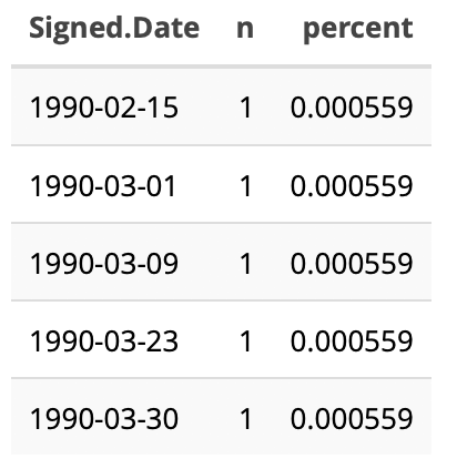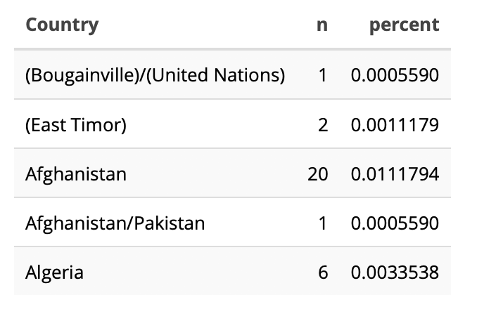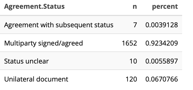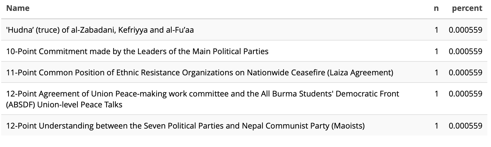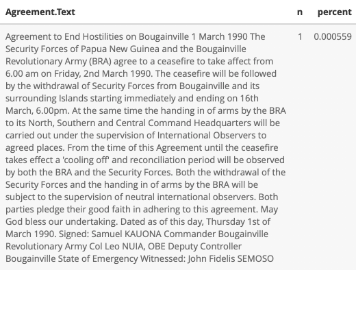 Empezaremos analizando los datos obtenido Peace Agreements [10] , una base de datos documental sobre acuerdos de paz en todo el mundo firmados desde el 1990 hasta hoy. Esta es una base de datos creada y mantenida por la Law School de la University of Edinburgh con de cerca de 2000 documentos legales. Esta base de datos esta formada por 12 columnas y 1789 filas.