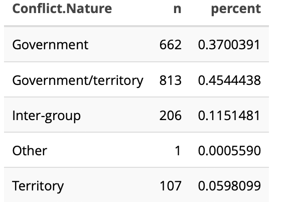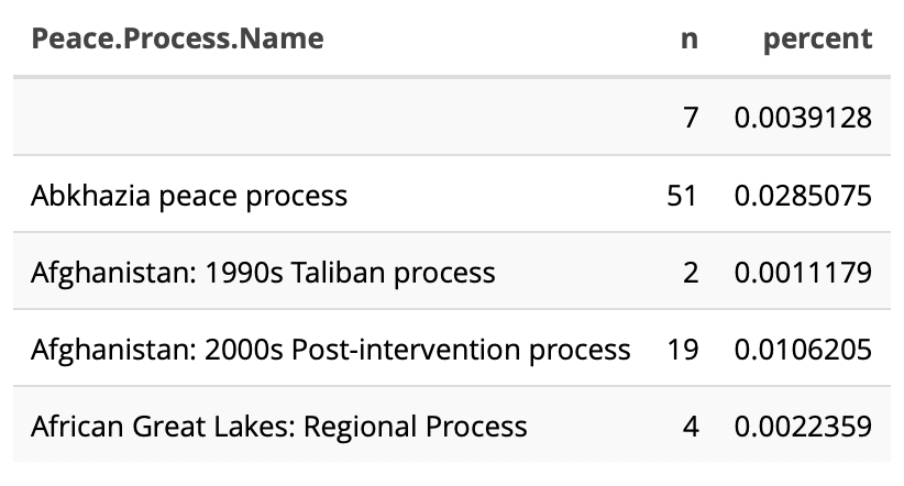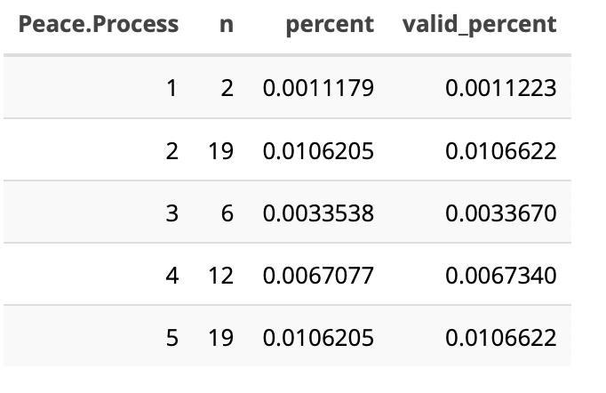Empezaremos trabajando con la estructura de Peace Agreements, donde a continuación mostraremos la estructura de la información obtenida de su base de datos: 14 Resumen de la información obtenida de Peace Agreements A partir de la figura [14] , se puede comprobar el tipo de dato que gestionamos y su estructura. También obtenemos medias y medianas para validar el rango de los datos obtenidos por si existe algún tipo de dato erróneo. Otro paso importante es observar si existe algún elemento con valores nulos. Por ejemplo, en la imagen [10] ya se puedo comprobar su existencia. En esta base de datos las columnas Peace.Process y Peace.Process.Name disponen de ese tipo de información.