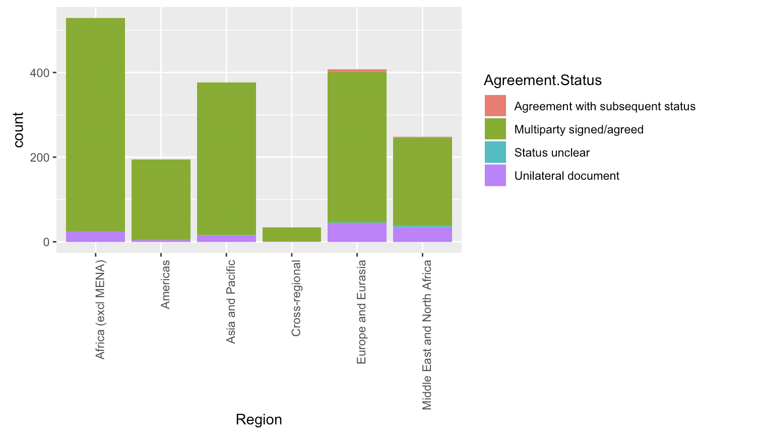 A partir de este punto, y analizado el tipo de datos escogido, he realiza una pequeña transformación para valorar cuantos tratados existen en el mundo y en que zonas del planeta están distribuidos. También he añadido en ese mismo gráfico la cantidad de tratados subdividido por tipo. 17 Cantidad de tratados firmados en el mundo divido en continentes. En esta gráfica podemos analizar que tipo de tratado es el más habitual (Multiparty signed) y en que continente existen más tratados alcanzados (África).