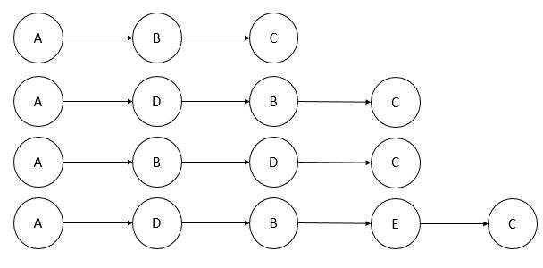 Los caminos que existen son: D-B-C-E y D-B-A-C-E