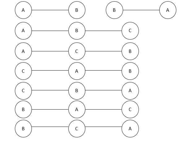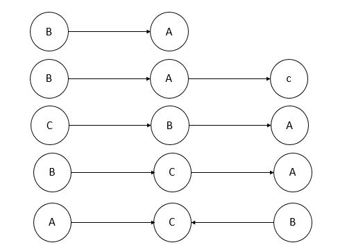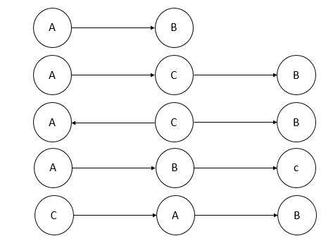 Sea P una distribución de probabilidad que satisface las siguientes propiedades de dependencia e independencia: Ip (A, B), Ip (A,C), Ip (B, C), Ip (A, B C), Ip (A, C B), Ip (B, C A) Dibuje todos los grafos no dirigidos y y grafos dirigidos acíclicos de tres variables que sean mapas de indepencia (I-maps) de P.Recordando que para que un grafo G sea un mapa de independencias de una distribución de probabilidad P basta que toda relación de separación en G se corresponda con una relación de independencia en P; no hace falta que toda la relación de independencia en P tenga que estar reflejada como separación en G.Basándome en el anterior párrafo, he encontrado lo siguientes grafos que cumplen todas las condiciones del enunciado: